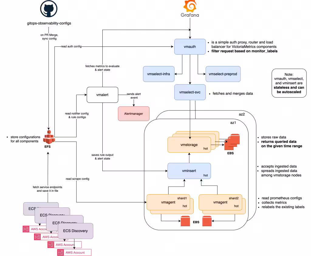 The centralized model was the key. Instead of engineers hunting across siloed Prometheus instances, all telemetry funnels into VictoriaMetrics and is queryable through one interface.